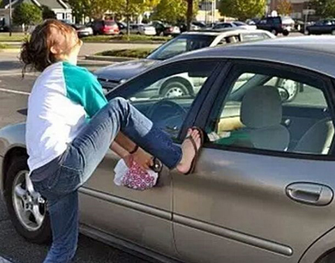 女子早上班时车钥匙不知在哪里,非常之着急,眼看就要迟到了,使用蛮力开车门